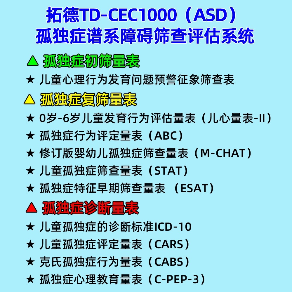 • 拓德0-6歲孤獨癥譜系障礙篩查評估系統(tǒng)ASD心理教育量表CPEP3