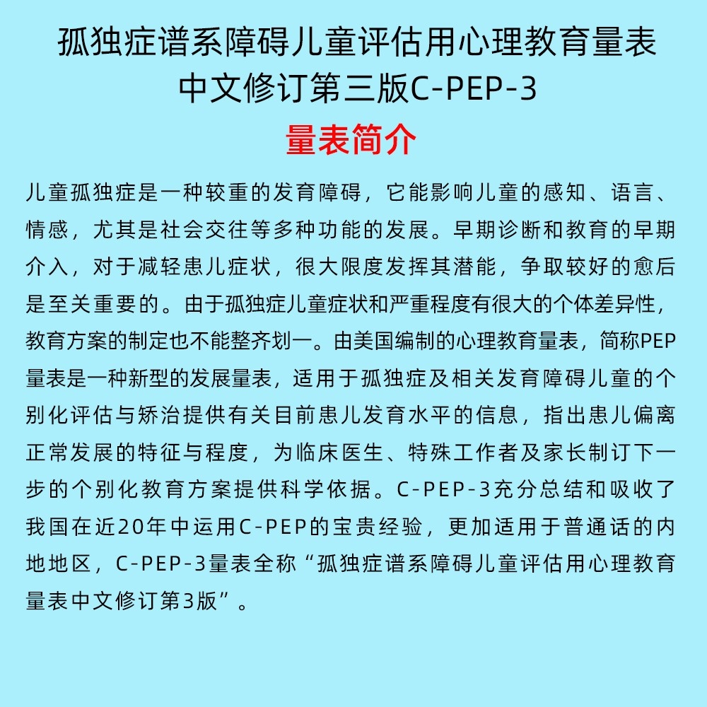兒童孤獨(dú)癥是一種較重的發(fā)育障礙,它能影響兒童的感知、語(yǔ)言、情感,尤其是社會(huì)交往等多種功能的發(fā)展。早期診斷和教育的早期介入,對(duì)于減輕患兒癥狀,很大限度發(fā)揮其潛能,爭(zhēng)取較好的愈后是至關(guān)重要的。由于孤獨(dú)癥兒童癥狀和嚴(yán)重程度有很大的個(gè)體差異性,教育方案的制定也不能整齊劃一。由美國(guó)編制的心理教育量表,簡(jiǎn)稱PEP量表是一種新型的發(fā)展量表,適用于孤獨(dú)癥及相關(guān)發(fā)育障礙兒童的個(gè)別化評(píng)估與矯治提供有關(guān)目前患兒發(fā)育水平的信息,指出患兒偏離正常發(fā)展的特征與程度,為臨床醫(yī)生、特殊工作者及家長(zhǎng)制訂下一步的個(gè)別化教育方案提供科學(xué)依據(jù)。C-PEP-3充分總結(jié)和吸收了我國(guó)在近20年中運(yùn)用C-PEP的寶貴經(jīng)驗(yàn),更加適用于普通話的內(nèi)地地區(qū),C-PEP-3量表全稱“孤獨(dú)癥譜系障礙兒童評(píng)估用心理教育量表中文修訂第3版”。